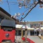暖かい日差しの下、園庭の桜が綺麗に咲いています。